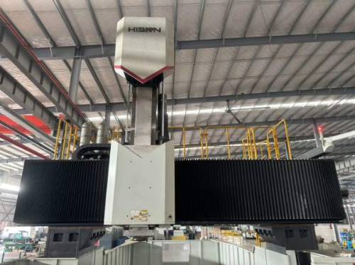 海天5米龙门,工作台3米*5米,门宽3.65米,门高1.57米,方华枕450*450,带全自动铣头,行程5500*3700*1250。BT50电主轴8000转,发那科MFPlus系统
