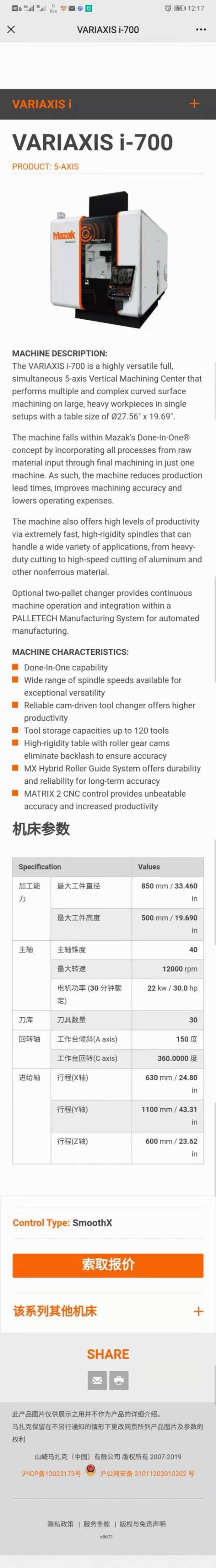 日本原装马扎克VARiAXiS-i700立式摇篮五轴联动加工中心,标准版参数见下表。此机有加装配置,刀库40把带中心出水,雷尼绍检测